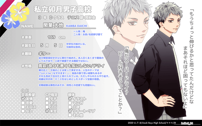 男子校創作企画の私立卯月男子高校【@UzukiTL】に4人目で参加させていただきます。 よろしくおねがいします。 #卯月高_Aクラス #卯月高_在学生 #卯月高_CS
