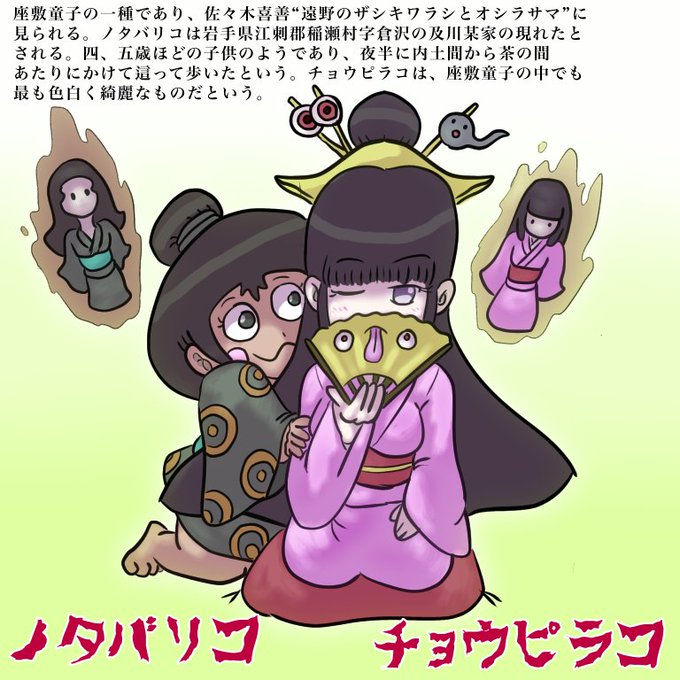 5月30日は #古民家の日 なので、“チョウピラコ”と“ノタバリコ”です。生まれた家は違えど二人は仲良し!座敷わらしとなってからも仲良く遊び続けましたとさ。