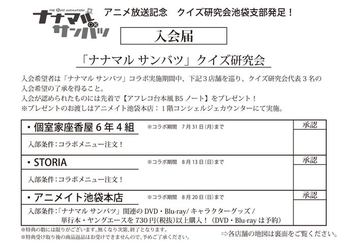 #ナナマルサンバツ コラボ実施期間中、各店舗で“入会条件”をクリアすると、入会届(スタンプラリー台紙)にクイズ研究会代表(笹島学人、新名匠、芦屋洋介)の“承認印”を押してもらえます。3名全員から入会が認められた方には先着で【アフレコ台本風B5ノート】を入会記念としてプレゼント!