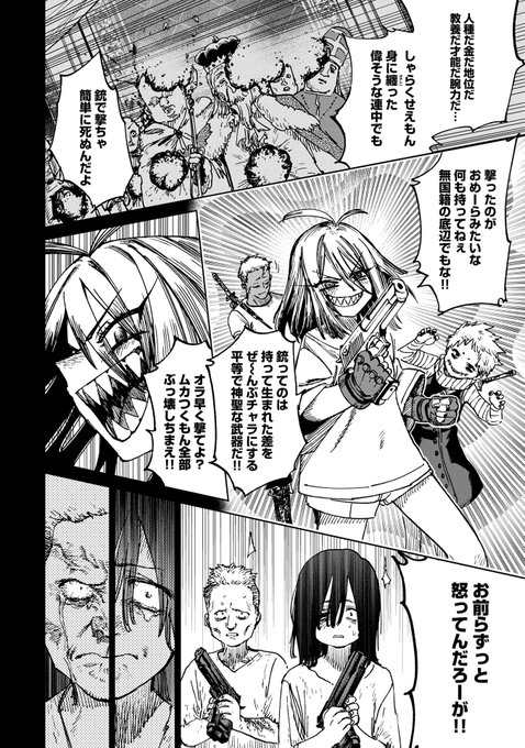 原作担当させてもらってる「囚人転生」15話③が無料公開されました。主人公一行が調子こいてたテロリストをシバく回です。漫画の続きはリプ欄に。(1/3)