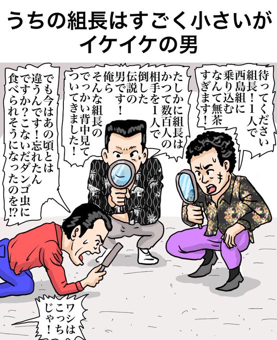 【解説】「この組長だと敵は乗り込んで来たかどうかわからないよね」「団子虫に食べられそうになった時は『大変だ!組長が団子虫に襲われてるぞ!』と騒ぎになったろうね」「子分は『ダンゴ虫入れるとは何事じゃ!指つめ!』と叱られたろうね」#漫画
