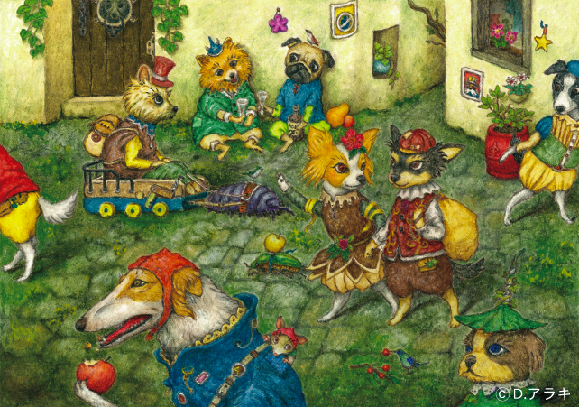 ウーム大陸北西部のイヌ族の国、ジグ公国の都”ツェト”で一番賑わう通り。中央の広場は住民の待ち合わせ場所としてよく利用される。(D.アラキの裏地球より)