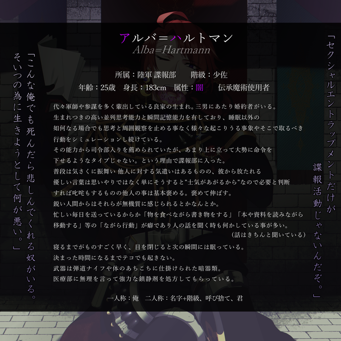 アルバ=ハルトマン/25歳/183cm(+5cmヒール)/陸軍(Sterne)諜報部/少佐/伝承魔術使用者(闇)