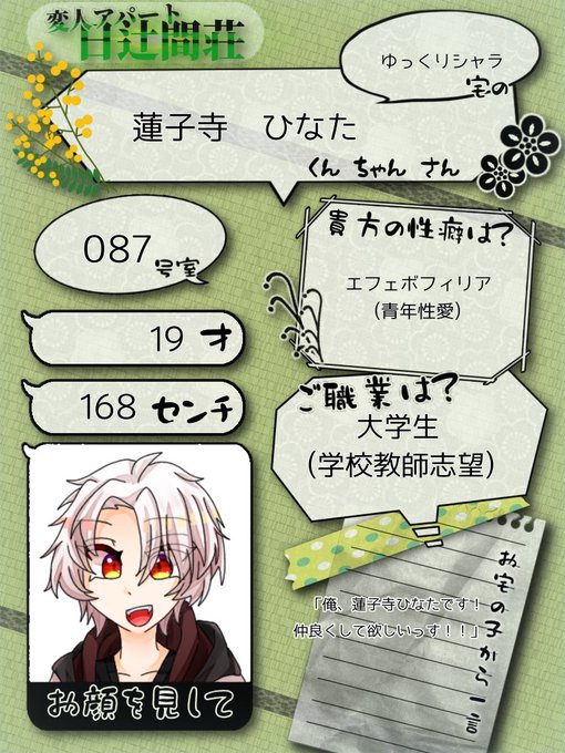 私の性癖を沢山詰め込んだせいかかなりやばめな子になってしまいましたがこれから仲良くしてくれたら嬉しいです!!!宜しくお願いします〜!!!o((*^▽^*))o