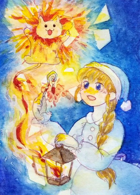 「夜のともだち」 ATCサイズだから小さいけど、久々に水彩で絵描いた! 小さいライオンなのかフサフサを付けたネコなのか、それが問題だ。