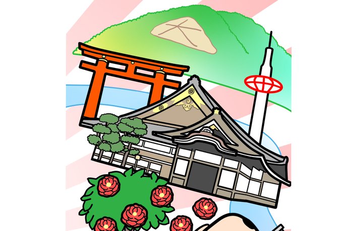 浮世絵風の幽水荘をよく見ると京都の名物、清水の舞台と大文字山が…👀❗️