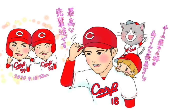 2020.9.10 カープ 2-1 ヤクルト プロ入り初の中5日 7回7奪三振1失点で チーム最多の6勝目✨ 僅差を勝ち取る先輩達の 存在も大きかった😊🎏 #カープ #イラスト #りことしゃもじ #森下暢仁 #大盛穂 #菊池涼介 #ヒーローインタビュー も #素敵✨