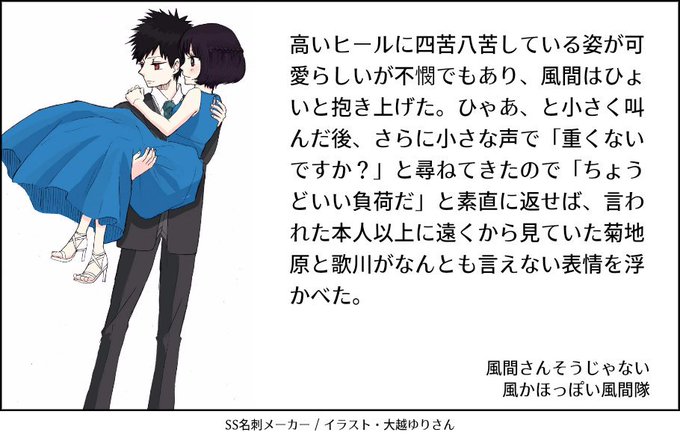 @yuri_o2 大越さんの描かれる風間さん飄々と格好よくて歌歩ちゃんは可愛すぎるしで大好きですー!しゃっくり止める漫画は萌え転がりました!タグの分、こちらの三枚に萌えたぎりすぎましてこうなりました!素敵な萌をありがとうございますヽ(´▽`)/これからも更新楽しみにしてますー!