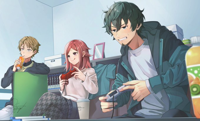 太刀川+女の子アンソロジーにイラストで参加させていただきました! 太刀川さん+おサノ(+麻雀組メンツ)で対局前に諏訪隊陣形の相談してるところ⚔️ ありがとうございました!!