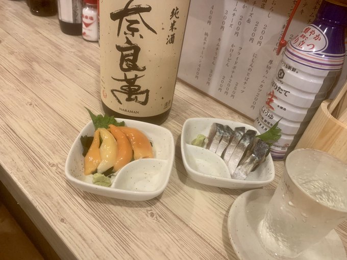 貝づくしに〆鯖。 そして日本酒、奈良萬。