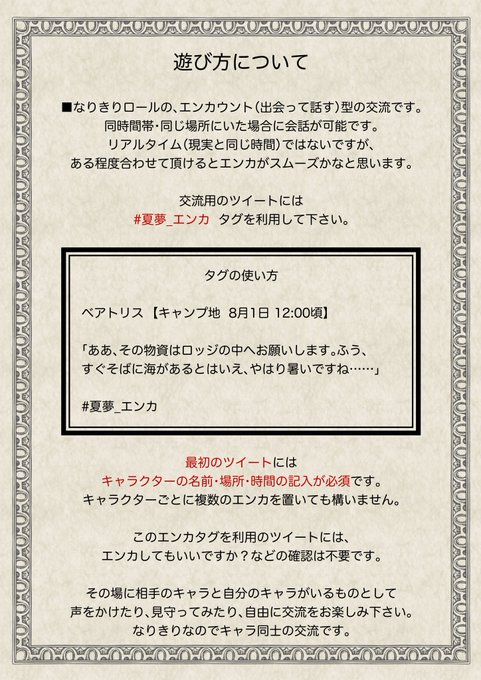 【真夏の夜の夢】 イベント概要です。今までと違うストーリー進行型のなりきり交流イベントとなります。詳細はまた近くなりましたら追記いたしますが、質問などがありましたらDMにてお問い合わせ下さい。 #契約の魔法戦記_イベント #契約の魔法戦記_公式