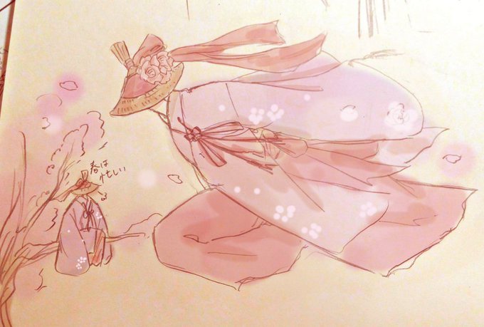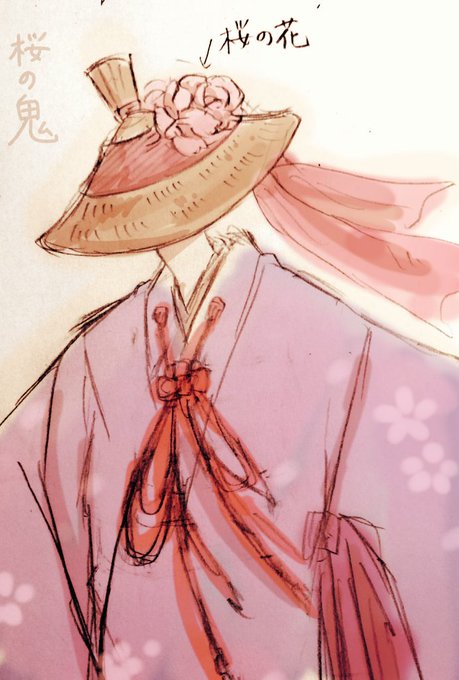 @vwvwv14 桜の鬼。笠を深く被っているので角は見えない。走り回って、桜を満開にしていく。 「鬼」は妖とも神様とも言える存在。