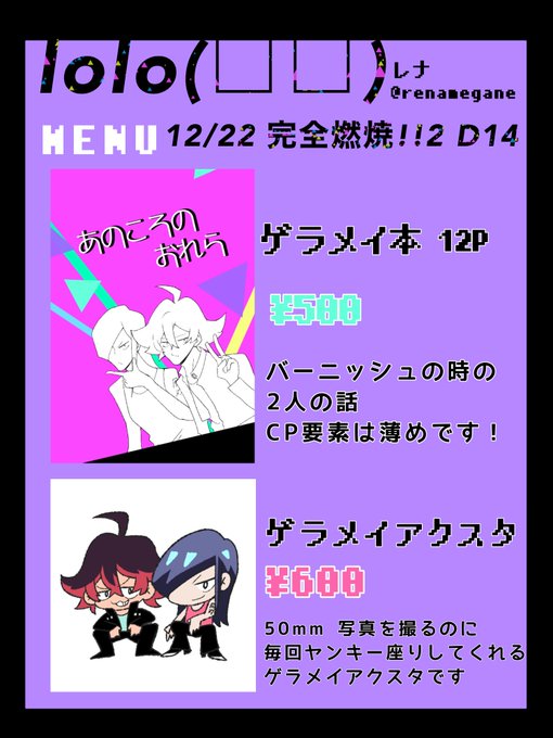 明日12/22の完全燃焼!!2に委託スペースで参加しております!【委託02a】です!(お品書きは前回の物でスペースとか日にちとか古いですが、頒布物は一緒です)