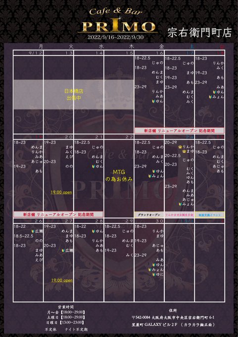 9/16 18:00~PRIMO宗右衛門町店 移転 ❤︎゛