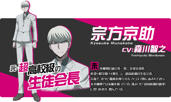 ダンガンロンパ:宗方京助+雪染ちさ+逆蔵十三+安藤流流歌+十六夜惣之助+黄桜公一+霧切仁+忌村静子+グレート・ゴズ+月光ヶ原美彩+天願和夫+万代大作+ 御手洗亮太+九頭龍菜摘+サトウ