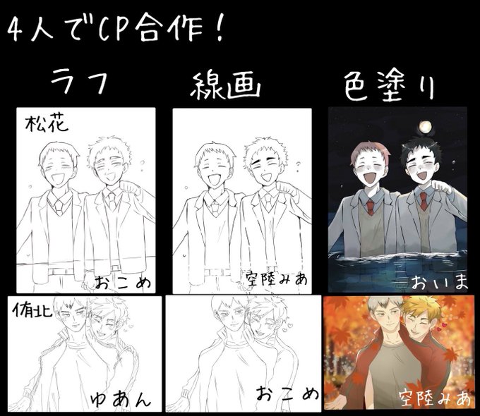 代表で私が載せます! 合作しました🫶🏻 宮宮/影日/松花/侑北 詳しいことと完成図はリプに貼ってます