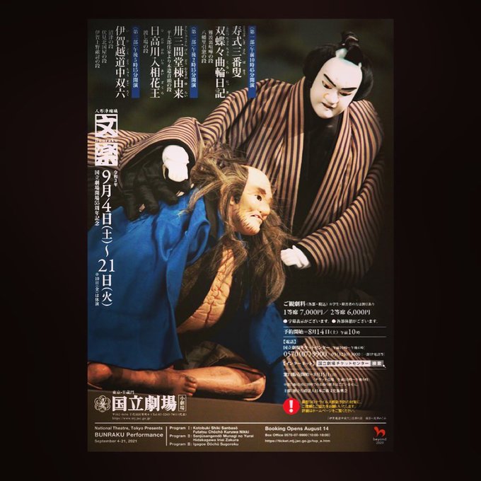 文楽 9月東京公演!🎉国立劇場開場55周年を記念して㊗️『寿式三番叟』をはじめ『双蝶々曲輪日記』『卅三間堂棟由来』『日高川入相花王』『伊賀越道中双六』を上演しております!21日まで宜しくお願い致します!(10日は休演)皆さまのご来場をお待ちしております🙇♂️😊