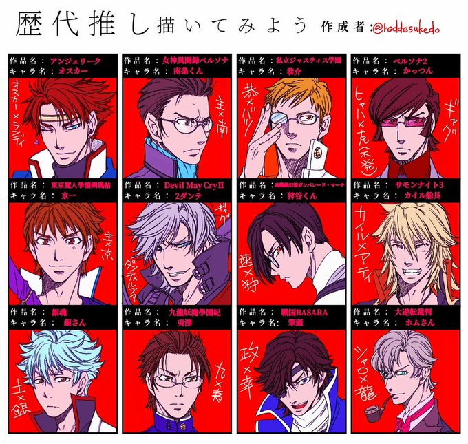 #歴代推し描いてみよう テンプレお借りしました。 今まで本を出した事のある推しで描いてみたよ〜。世代がバレるけどな! 厳選ジャンルの1人に絞ったけど、まだまだいっぱいいるんだ...外法帖とか...小十佐とか...無双とか...ムニャムニャ...。