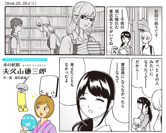 【きらら7月号⑤】大人気連載コミック!館石直進さん(@0711Naoyuki)「本の妖精 夫久山徳三郎」☆書店員にならなかったら何になってた?──駅にできた新しい書店からの帰り道、本多さんの答えを聞いた小宮さんは……|*こちらは来週「小説丸」にもアップ予定