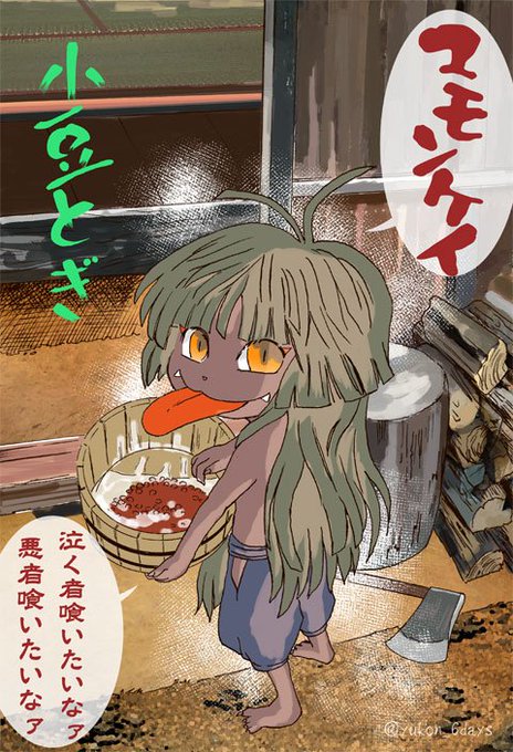 On le repére près des rivières par un bruit de frottement, shoki, shoki (#ショキショキ), qu'il fait en lavant des haricots azuki (#小豆).
