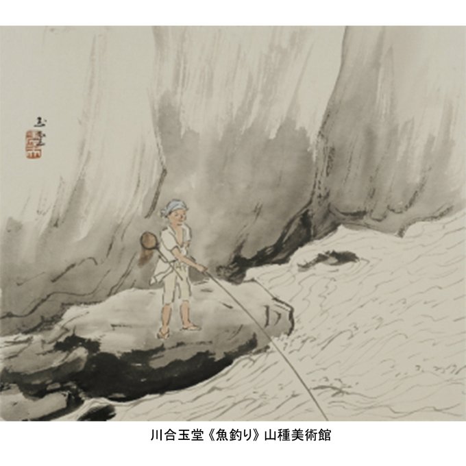 網を持ち、釣りをする少年の姿は長良川のほとりで育った玉堂自身の姿にも重なるかのよう。
