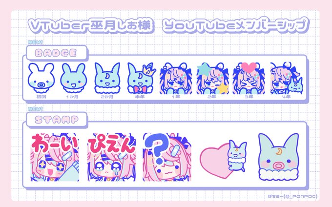 VTuber巫月しお(#shio_mitsuki)さんの新しいメンバーシップバッジとスタンプイラストを描かせていただきました。