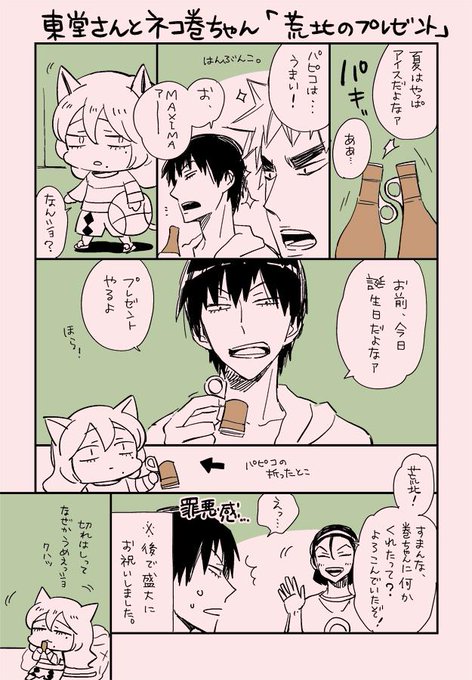 東堂さんとネコ巻ちゃん「荒北のプレゼント」 荒北さんは巻ちゃんと遊んでるだけです^^ タグ付けていいか悩んだけど い、一応… #巻島裕介生誕祭2015