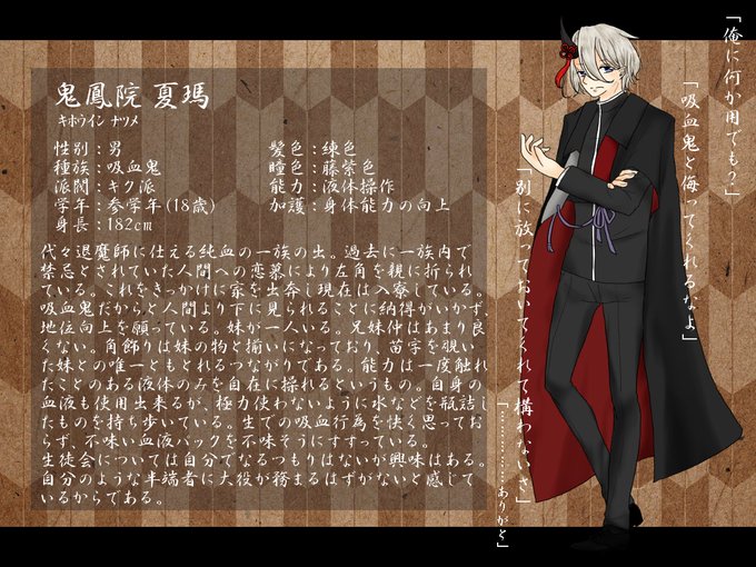 こちら(@tcm_TL)の素敵な企画様に3人目の参加失礼します!一匹狼気質な吸血鬼です。何卒よろしくお願いします。
