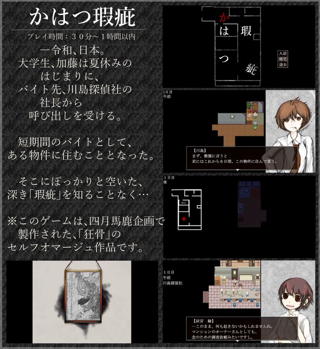 1時間半くらいでクリアできる探索ノベルゲーム。1周20分程度。