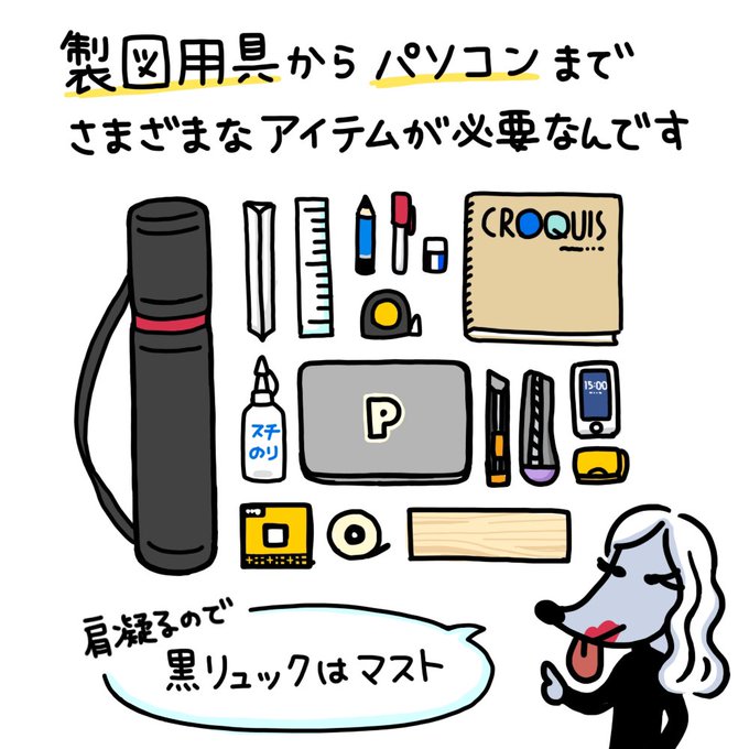 まだ建築学生だから実際どれくらい絵を描くのかわからないけど、趣味の絵を描くことが嫌いにならない程度にちょっと絵を描くことをしたいと思って消去法で来た建築が最適だった!あと、今は設計がとても楽しい。