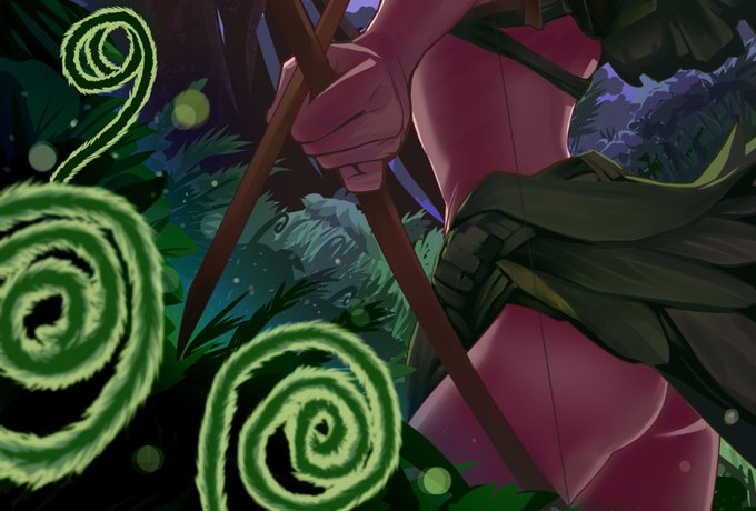 <月下の邂逅> 少数民族の衣装とかで資料を漁っていたら、葉っぱを巧みに編み込んで服を作っていたのが印象的でした。布とかもジャングルでは手に入りにくいですもんね。納得。#描き揚げ部 #お題は月 #廻散 #ツーティエ