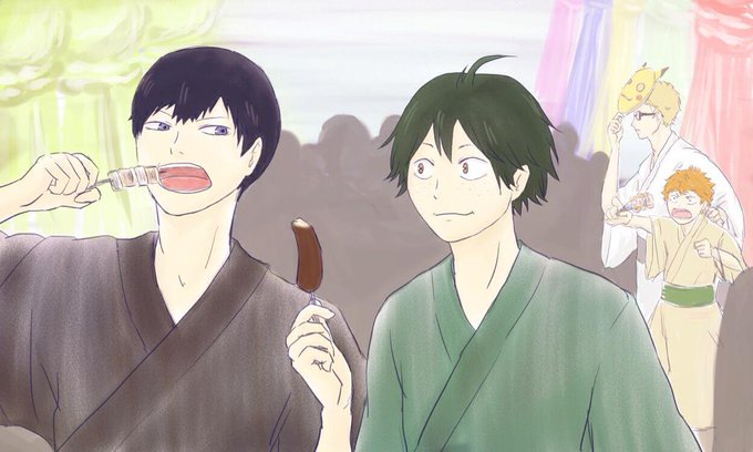 #影忠版深夜の真剣お絵描き60分一本勝負 【夏休み】 七夕祭り影忠ちゃんとおまけで月日ちゃん 「影山これ食べる?」 「おう」 何も知らない日向と全て知っている月島