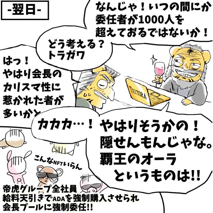 カルダノ幼稚園シリーズ その14「会長 SPOになる?」 SPO:ステークプールオペレーターの略 ADAホルダーからブロック生成権利を任され、カルダノネットワークの保守保全を担う者 ⚠️ADAホルダーはSPOに対し一切ADAを送金する必要はない。復元フレーズ・パスワードも誰にも教えない! #ada #cardano