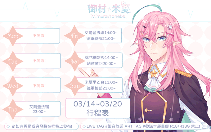 ☆03/14~03/20行程表★ 諸君晚安~!✨接下來是行程錯亂ㄉ一週ㄛ🥲大家這週也陪米夏一起加油度過吧🥰 🌟03/17 艾爾登法環23:00~ 🌟03/18 艾爾登法環14:00~ 德軍總部21:00~ 🌟03/19 棉花糖雜談14:00~ 隨意歌回20:00~ 🌟03/20 米夏早ㄛ台11:00~ 德軍總部21:00~ #御音放送 #台灣vtuber #台V