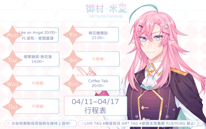 ☆04/11~04/17行程表★ 諸君晚安~!✨下週的行程表出爐咯🌟接下來是連動與趕進度的一週☕️ 米夏好想逃跑😇 🌟04/11 Like an Angel 14:00~ Ft.梁和、星間菖蒲 🌟04/10 德軍總部-新巨象 14:00~ 🌟04/15 棉花糖雜談 21:00~ 🌟04/17 Coffe Talk 20:00~ #御音放送 #台灣vtuber #台V