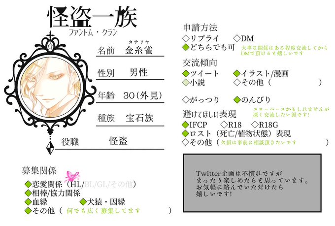 怪盗一族(@PhantomClan_TL )さまに僭越ながら二人目の参加でございます。(交流シートは関係募集タグと共に、補足なども後日リプライで繋げようと思ってます。)