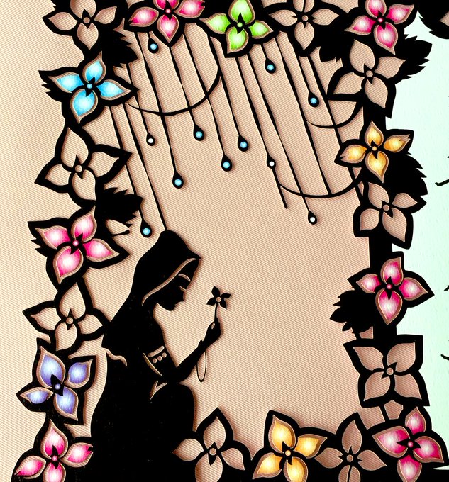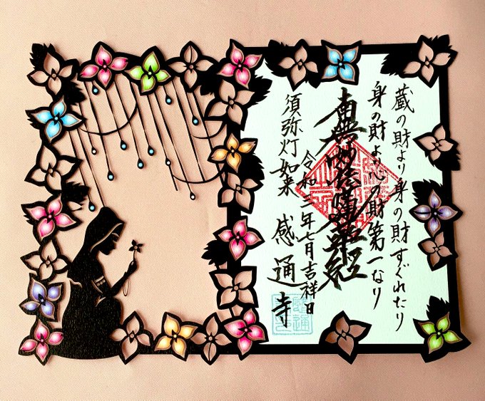 東京都 感通寺⛲️ 6.7月限定、紫陽花の切り絵御首題です🌺✨Instagramで見て一目惚れ😆郵送依頼し、届きました💕とーっても綺麗な切り絵御首題です❣️しばらくお部屋に飾ります✨台紙を変えると雰囲気変わります✨