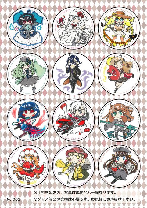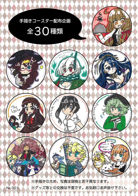 人増えてきたので、手描きコースター配布企画(グッズ交換不要)の絵柄一覧と、現状交換できるグッズ一覧(交換グッズは応相談)載せときますね! #シノアリス #シノアリスコラボカフェ
