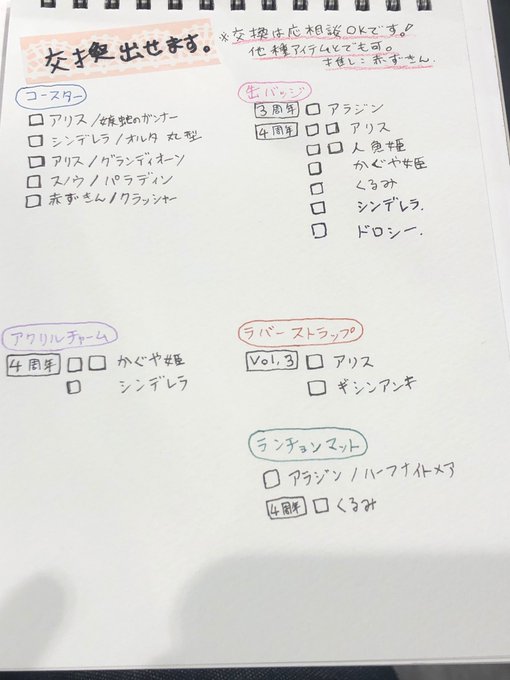 現時点で交換可能グッズ一覧(2枚目)と手描きコースター一覧(3枚目)。