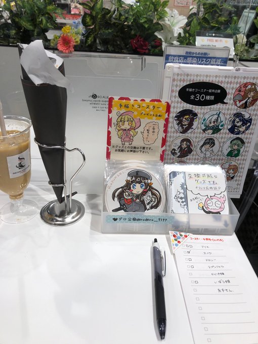 手描きコースター(4枚目が一覧)の配布企画も継続中! 机上の展示、赤い鞄や胸元に付けた缶バッジを目印にお声掛け下さい〜。