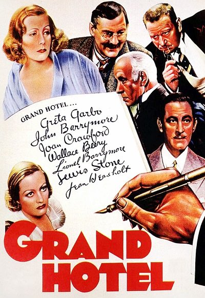 1932年映画「グランドホテル」。のちに「グランドホテル形式」という映画・演劇用語の元になった群像劇です。最近では「マスカレードホテル」も同じ。