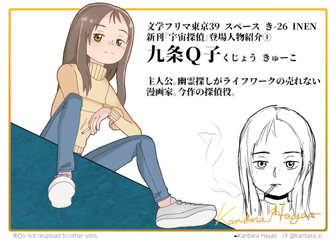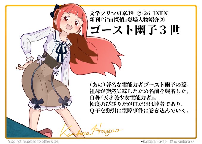 文フリ東京40(5月11日)で頒布予定の『宇宙探偵』より、主人公のバディとなる少女・ゴースト幽子3世のビジュアルイメージです。主人公をとにかく振り回してくれるエネルギッシュなキャラクターになることを願ってこの設定しました。