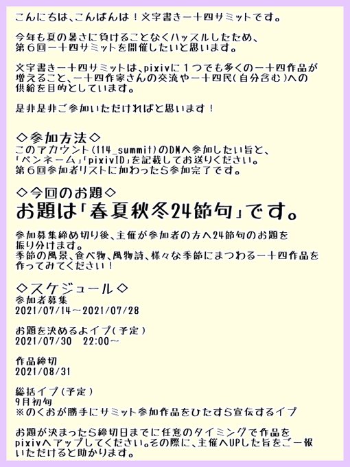 参加者の方へ24節句のお題をお渡しいたしますので担当になった季節のお話を一十四で書いてください!