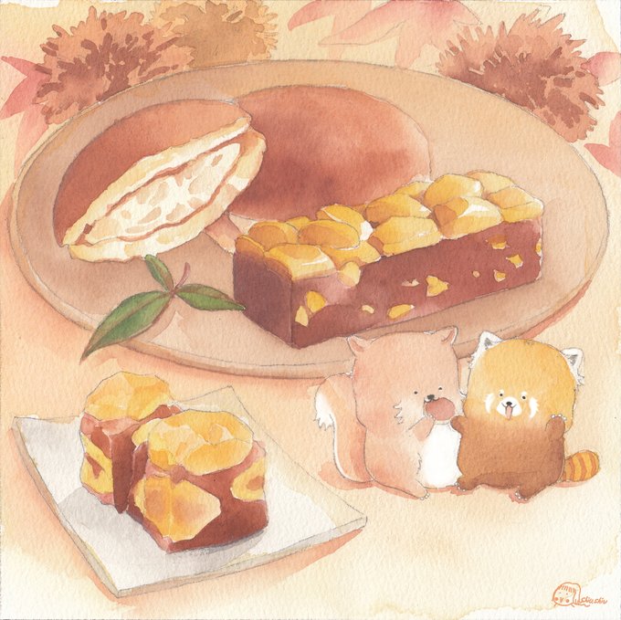 秋のおいしい栗とさつまいも #芋きんつば #栗饅頭 #サツマイモ #くり #水彩絵の具 #和菓子 #可愛い挿し絵 #ポンちゃん #ブブ #栗子 #地瓜 #秋天 #手繪水彩練習 #日式點心 #LittlePom #Bubu #watercolor #shiushiu我行我素的插畫