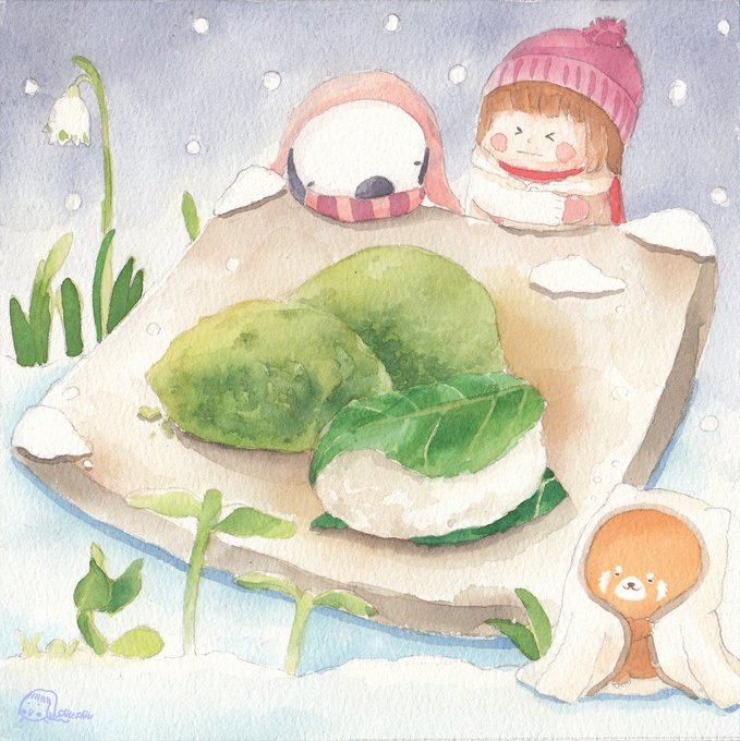 春は来たけれどやっぱりまだ寒いな #つばいもち #うぐいす餅 #水彩絵の具 #手繪水彩練習 #日式點心 #和菓子 #shiushiu我行我素的插畫