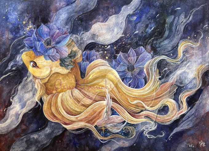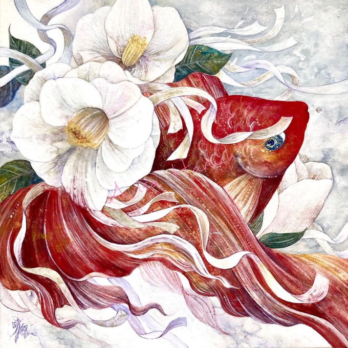 「心の拠り所」をコンセプトに、日本画材で想いや祈りを乗せた金魚と花を描きます。
