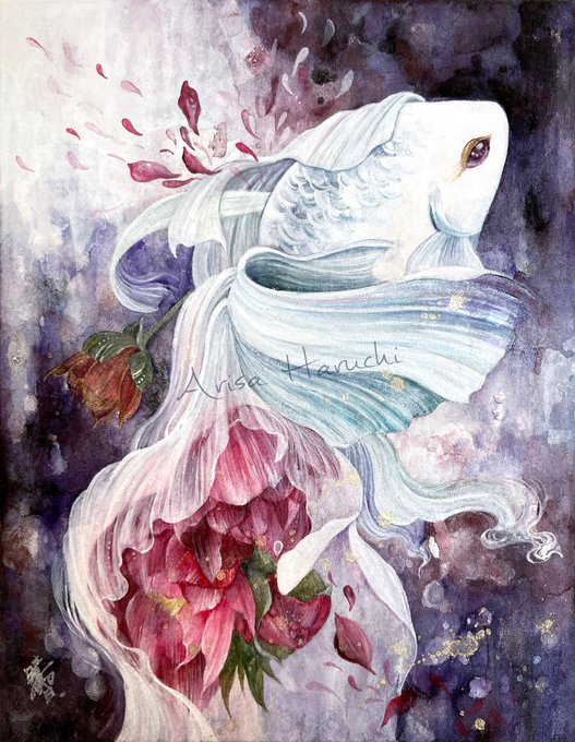 日本画材で感情などを重ねた金魚と花を描いています。