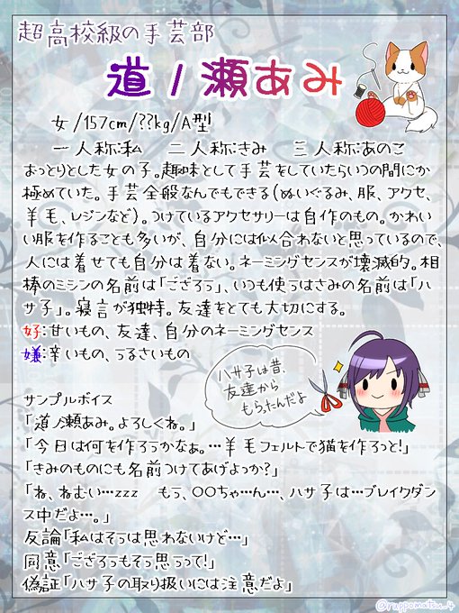 超高校級の手芸部の「道ノ瀬あみ」です。 手芸全般が好きなおっとりとした女の子です…! よろしくお願いします🙇 #明暗論破資料室