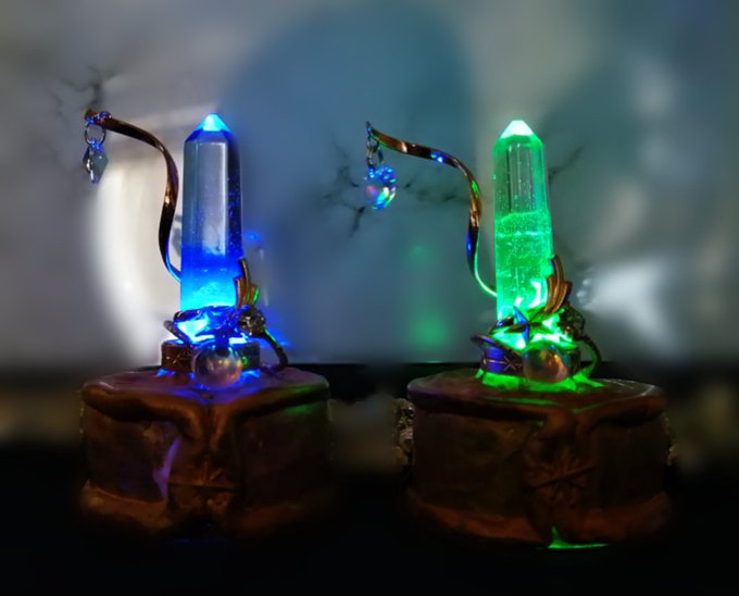 今回初めて #星森魔法市 に一般で参加したんですが、会場の照明が落とされていて明かりを各自で用意するというロマンに溢れたイベントでして…せっかくなのでいろいろ装備を光らせたいと思い、今回は『どれだけ百均で魔法っぽい装備を作れるか』を目標にして作りました。光らせるの楽しい!!!!