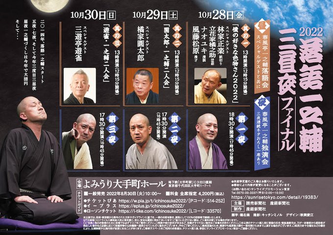 9月30日 なかのZERO小ホールにて開催致します『写真家 橘蓮二プロデュース 極vol. 12 ソコツ』出演:春風亭一之輔師匠・桂宮治師匠・開口一番 鈴々舎美馬さん、お囃子 森吉あきさん、デザイン 椋本完二郎さん、主催 夢空間 おかげさまでチケット即日完売致しました。ありがとうございました!